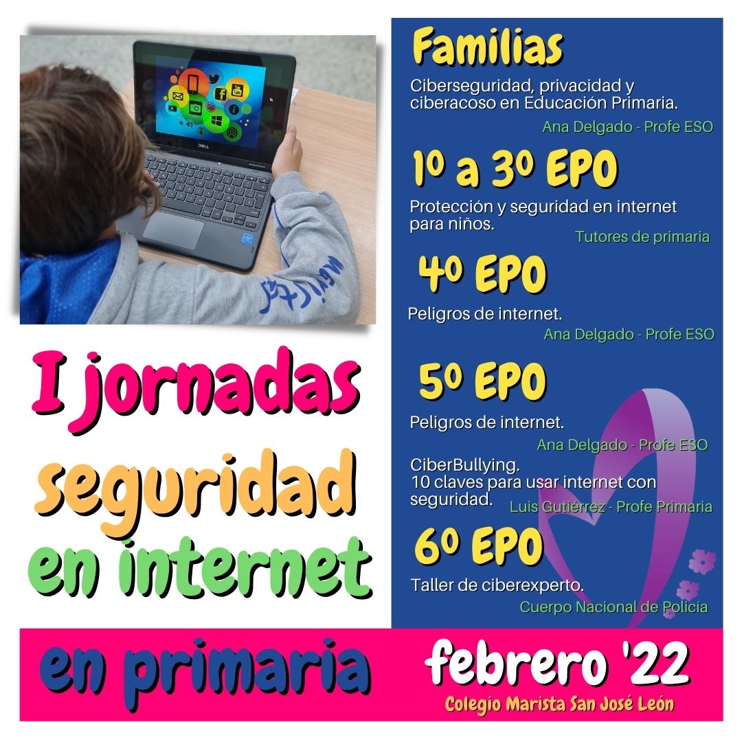Teniendo en cuenta estas necesidades y aprovechando que esta semana celebramos el Día Internacional de Internet Seguro, estamos realizando las I Jornadas sobre seguridad en internet primaria, pequeñas píldoras formativas a los padres y primeros cursos de primaria, sesiones más específicas a los de quinto y el taller de Ciberexper@ creado por la Unidad de Participación Ciudadana de la Policía Nacional, con el apoyo de Telefónica para nuestros alumnos de sexto.