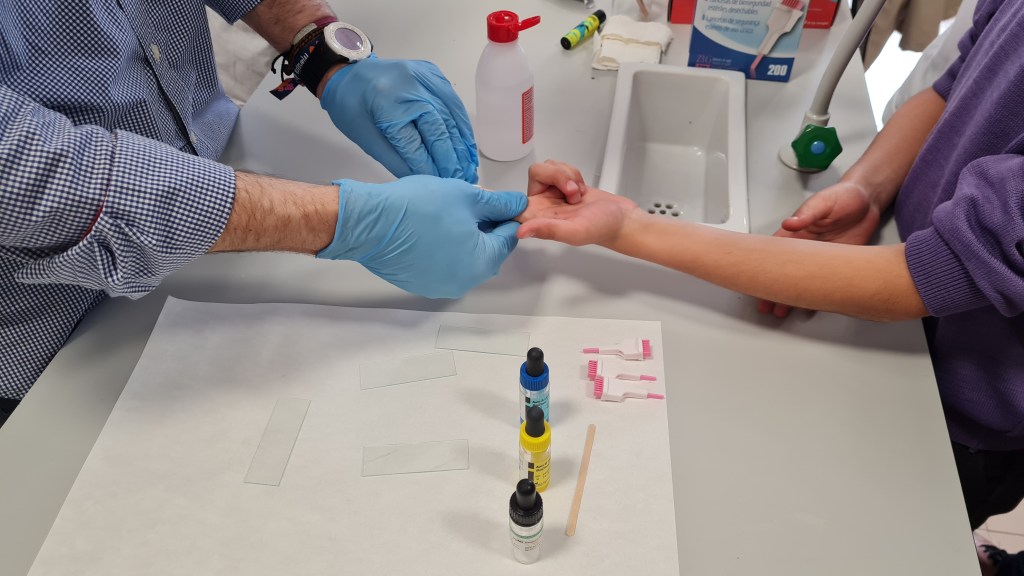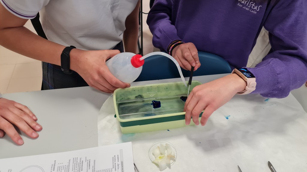 Hemos hecho una actividad conjunta con los alumnos de 4º de la ESO, han hecho de «profes» para los alumnos de sexto de primaria, les han ayudado a hacer su primera práctica de laboratorio: «observación de células de la epidermis de cebolla.