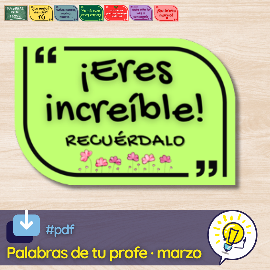 Listas las palabras de profe del mes de marzo. Para este mes he elegido estas palabras: «¡Eres increíble! Recuérdalo» Después de más de medio curso con mis estudiantes, he descubierto que son increíbles, cada día aprendo algo de ellos. #porsitevale aquí tienes el PDF con las etiquetas listas para imprimir, cortar y pegar. Palabras de … Continuar leyendo ¡Eres increíble!